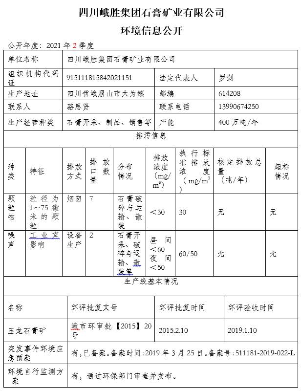 【公示】四川峨胜集团石膏矿业有限公司 2021年主要污染物排放监测公示表(2季度)