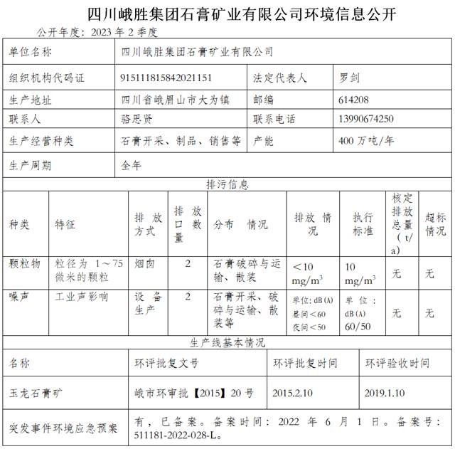 【公示】四川峨胜集团石膏矿业有限公司 2023年主要污染物排放监测公示表(2季度)